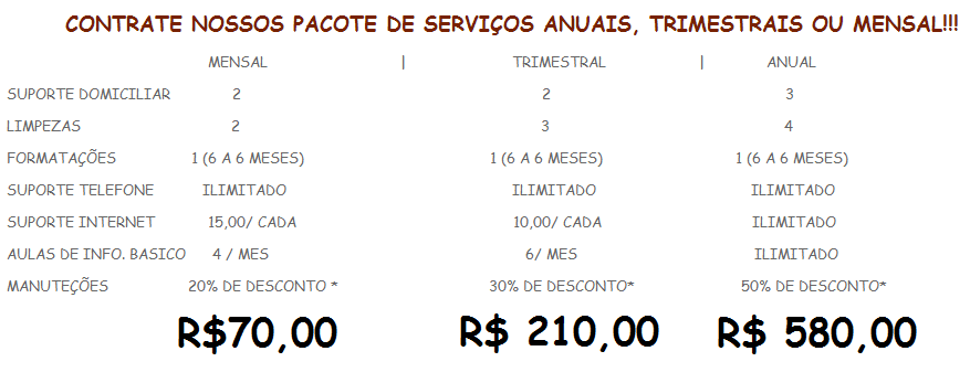 AS AULAS SÃO PARA MELHOR APOIAR NOSSOS CLIENTES A TER MELHOR UTILIZAÇÃO DE SEUS MICROSCOMPUTADORES E NOTEBOOK'S E SERÃO MARCADAS PARA TER DISPONIBILIDADE DE SER EXECUTADA, SÃO COM DURAÇÃO DE 1H 30MIN POR AULA.